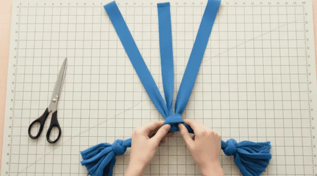 Hold your three fabric strips together. Tie a knot at one end, leaving a small tail of about 2 inches. This knot will be the base of your braid and will hold everything in place. Make sure the knot is tight and secure so it won’t unravel during playtime.